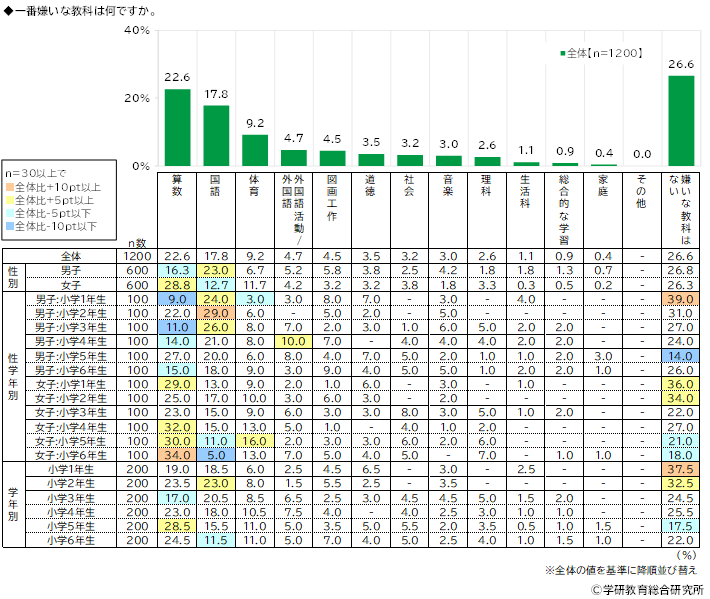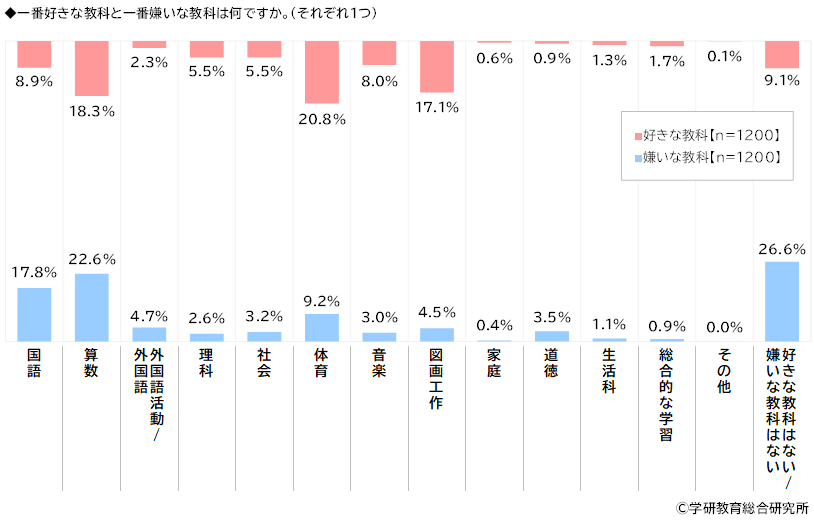 他方、一番嫌いな教科をきいたところ、1位「算数」(22.6%)、2位「国語」(17.8%)、3位「体育」(9.2%)、4位「外国語活動/外国語」(4.7%)、5位「図画工作」(4.5%)となりました。