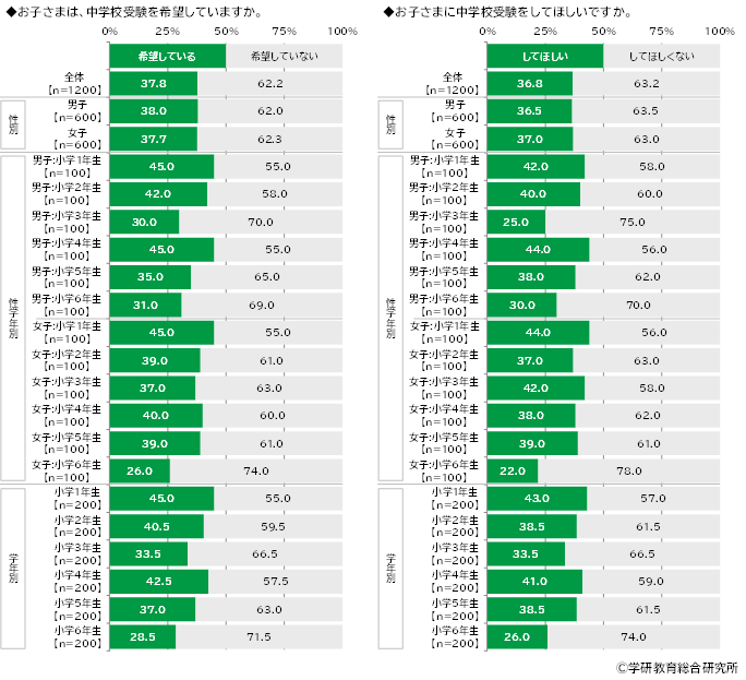 子ども自身が中学校受験を希望しているかをきいたところ、「希望している」は37.8%、「希望していない」は62.2%となりました。 他方、保護者に対し、子どもに中学校受験をしてほしいかをきいたところ、「してほしい」は36.8%、「してほしくない」は63.2%となりました。