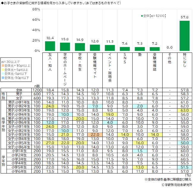 保護者に、子どもの受験校に関する情報を何から入手しているかをきいたところ、1位「友人・知人」(18.4%)、2位「学校のホームページ」(15.8%)、3位「学校・先生」(14.9%)、4位「受験情報サイト」(12.0%)、5位「イベント・説明会」(11.3%)となりました。 学年別にみると、「塾」は高学年で高くなる傾向がみられ、最も高い5年生では13.0%でした。