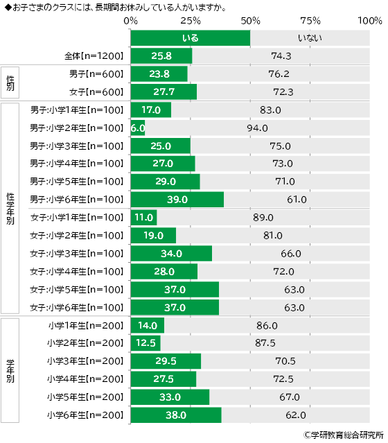 クラスには、長期間お休みしている人がいるかをきいたところ、「いる」は25.8%、「いない」は74.3%となりました。 学年別にみると、「いる」と回答した人の割合は、いじめを見聞きした経験と同様に、低学年と比べて中学年と高学年で高くなる傾向がみられました。