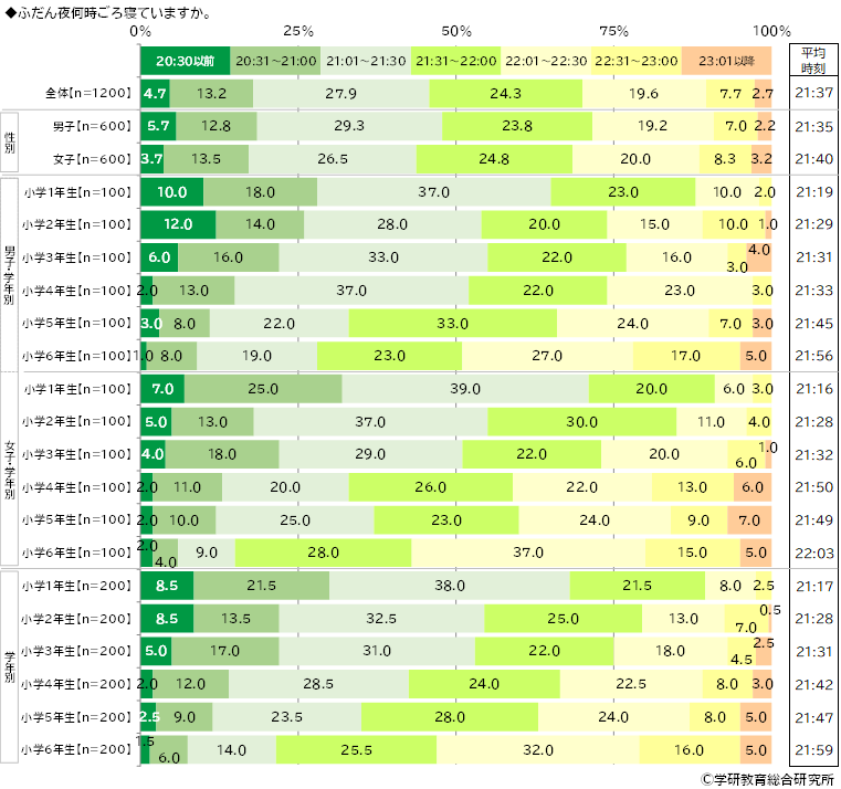 学年別にみると、平均時刻は上の学年ほど遅くなる傾向がみられ、6年生では21:59でした。