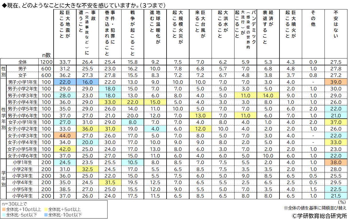 学年別にみると、1年生では「事件・犯罪に巻き込まれること」、2年生では「事故(交通事故など)に遭うこと」が1位でした。