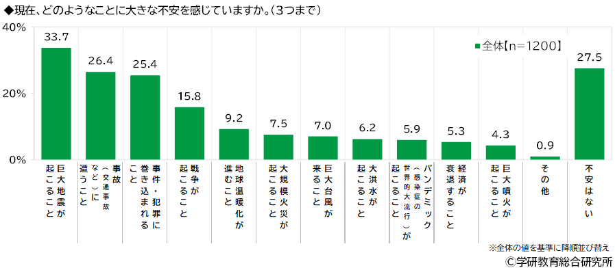現在、どのようなことに大きな不安を感じているかをきいたところ、「巨大地震が起こること」(33.7%)が最も高くなり、「事故(交通事故など)に遭うこと」(26.4%)、「事件・犯罪に巻き込まれること」(25.4%)、「戦争が起こること」(15.8%)、「地球温暖化が進むこと」(9.2%)が続き、不安がある人の割合は72.5%(「不安はない」27.5%)でした。