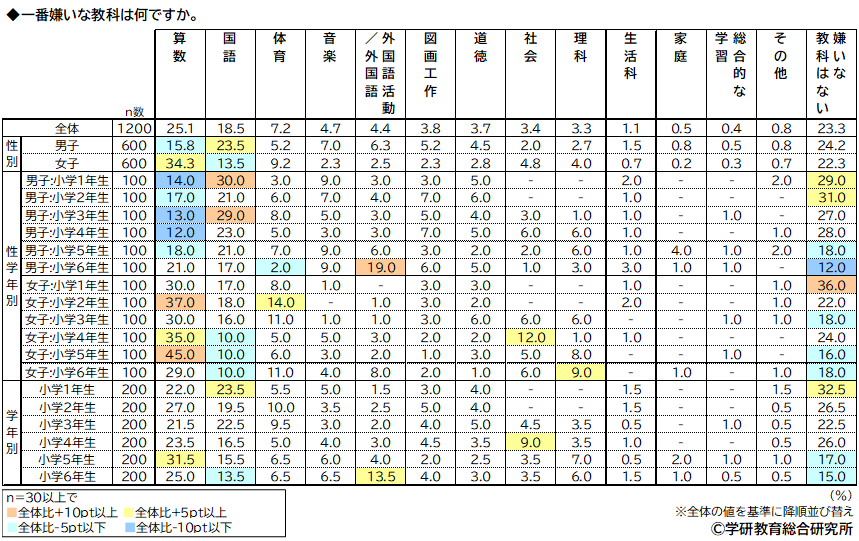 一番嫌いな教科を男女別にみると、男子の1位は「国語」(23.5%)、女子の1位は「算数」(34.3%)でした。また、「国語」(男子23.5%、女子13.5%)は女子と比べて男子のほうが10ポイント以上高くなり、「算数」(男子15.8%、女子34.3%)は男子と比べて女子のほうが10ポイント以上高くなりました。