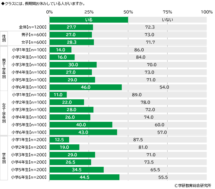 クラスには、長期間お休みしている人がいるかをきいたところ、「いる」は27.7%、「いない」は72.3%となりました。