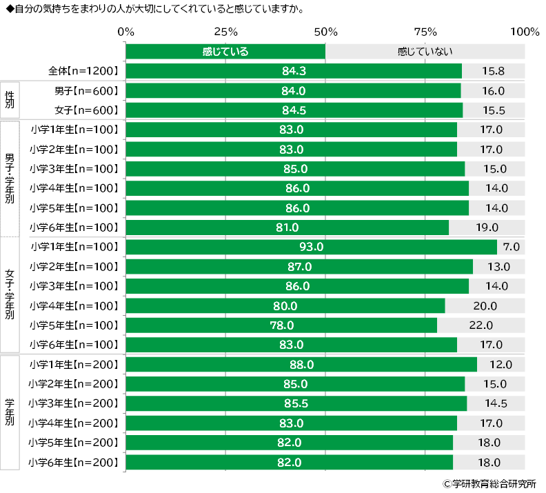 自分の気持ちをまわりの人が大切にしてくれていると感じているかをきいたところ、「感じている」は84.3%、「感じていない」は15.8%となりました。