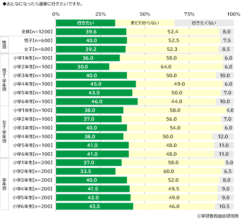 おとなになったら選挙に行きたいかをきいたところ、「行きたい」は39.6%、「まだわからない」は52.4%、「行きたくない」は8.0%となりました。 男女・学年別にみると、男子では、「行きたい」と回答した人の割合は、4年生以上で高くなる傾向がみられ、6年生では46.0%でした。