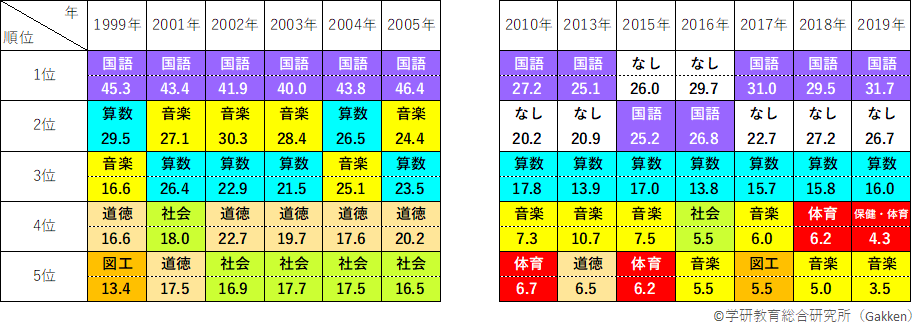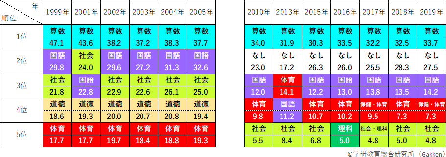 2010年より「嫌いな教科なし」の選択肢が導入されたものの、1989年以降の24回にわたる調査を俯瞰すると、「国語」「算数」、次いで「社会」が長年にわたりランクインしている。2000年代までは、僅差ではあるが「国語」の方が算数より人気が上回る傾向がみられるが、単数回答式となり選択肢に「嫌いな教科なし」が加わった2010年以降は「算数」が「国語」を追い越す傾向が出ている。