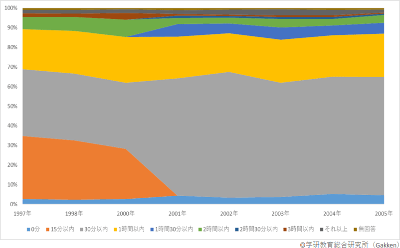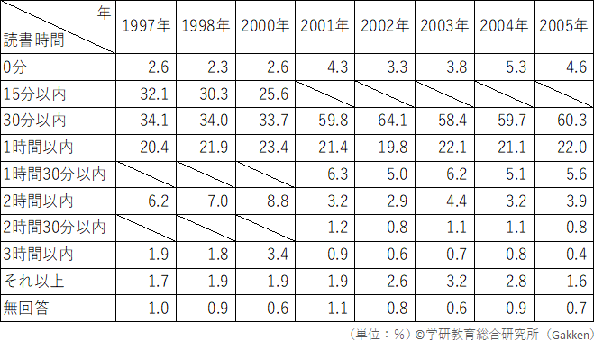 2001年を境に回答者が保護者から本人に変わり、選択肢の増減があったものの、1997年から2005年の8回の調査を通して、読書時間「30分以内」が6割超を占めていることがわかる。読書時間が30分以上1時間以内の児童も毎年2割前後と、一定の割合で推移している。小学生全体の読書時間の推移で特徴的なのは、0分と回答した「読書しない」児童の割合である。回答者が保護者から本人に変わった2001年以降、これまで2%台だったのが、3~5%台に増加している。一方、1日1時間以上読書している児童の割合は上昇傾向にあり、「1時間30分以内」「2時間以内」「2時間30分以内」「3時間以内」「それ以上」の合計は毎年12~16%台で推移している。