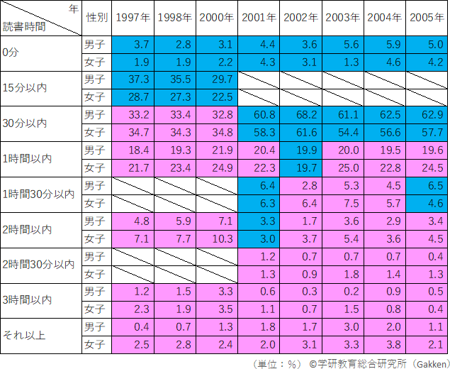 まず指摘できるのは、男子に比べて女子の方が長時間読書する傾向があるということである。これは、長時間の読書を示す表の下方に行くほど、表のピンクに塗られた箇所が圧倒的に多いことからうかがえる。この傾向は、保護者が回答した2000年以前に特に顕著に出ており、1日15分以上読書している児童の割合において、女子が全て多数となっている。本人回答となった2001年以降は、「30分以内」読書している割合は全て男子が多いという結果が出たが、1時間以上読書している割合は依然として女子の方が多数を占めている。