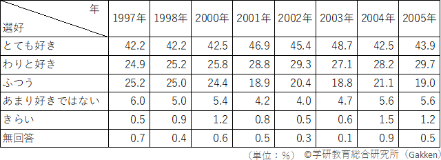 一方、「あまり好きでない」「きらい」を合わせた「読書嫌い」児童は毎年4~7%弱と少数で数値の変動幅も少ない。「ふつう」と回答した児童の割合は、保護者回答だった2000年以前は毎年25%前後だったが、本人回答となった2001年以降は20%前後に収まっている。数値の推移を追っていくと、2000年以前「ふつう」と回答した児童が、2001年以降「わりと好き」に変わったようである。1997年から2005年の『小学生白書』のアンケート回答者(『1~6年の学習』『1~6年の科学』の読者)は、総じて「読書好き」の傾向が高かったようだ。