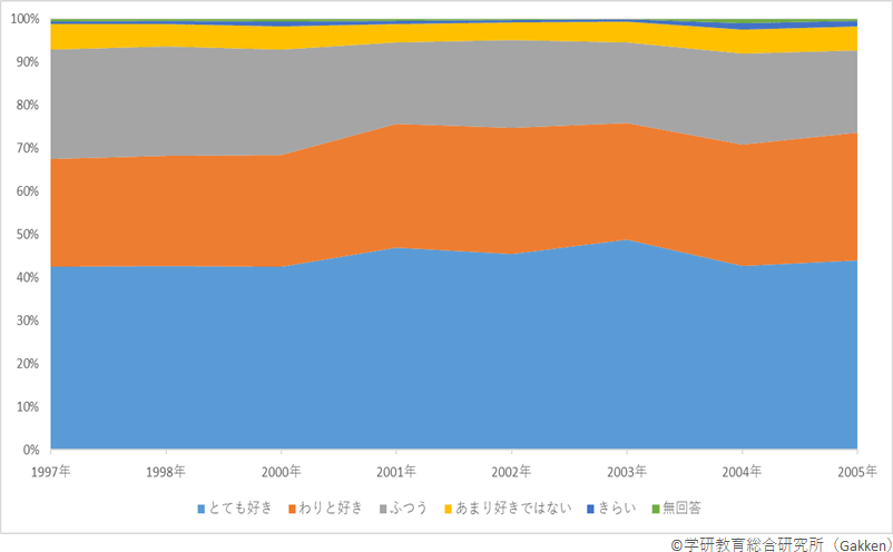 特徴としてまず指摘できるのは、読書が「とても好き」という回答の多さである。2003年の48.7%を頂点に全ての年で4割を超える児童が「とても好き」と回答している。「わりと好き」という回答も多く、最も低い1997年でも24.9%、その後は25%超の年が続き、2005年には29.7%が回答している。「とても好き」「わりと好き」を合わせた「読書好き」な児童は、いずれの年でも全体の3分の2を超え、本人回答となった2001年以降は、「読書好き」が70%超を維持している。