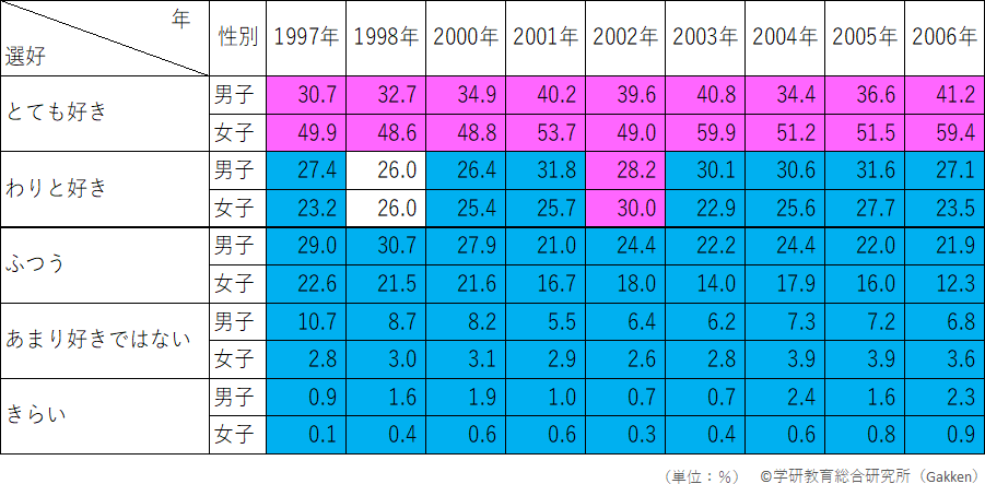 小学生の読書嗜好の男女差の傾向とその推移を示しているのが、表1-1-(4)-②-cである。この表では、各回答中、男子の割合が女子を上回った箇所を水色、女子の割合が男子を上回った箇所をピンクで塗り分けた。結果、小学生の読書嗜好においては、女子に顕著な傾向があることが判明した。すなわち、読書が「とても好き」な女子が、男子と比較して顕著に多いということである。「とても好き」と回答した割合を見ていくと、9回の調査全てで女子が男子を10~20ポイントと大幅に上回っている。一方、「わりと好き」「ふつう」「あまり好きではない」「きらい」においては、ほとんどの場合で男子が女子を上回っており、このことからも、男子と比較して女子の方が読書を好む傾向がうかがえる。