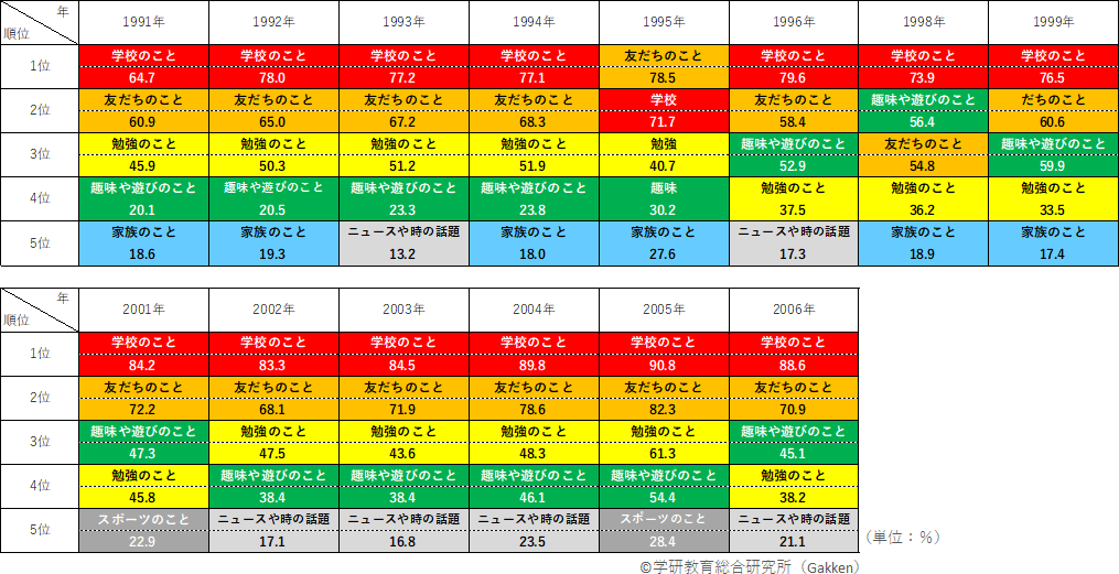 「学校のこと」「友だちのこと」は定番のトピックといえるが、3位以下にも特徴がみられる。1995年までは4位と大差をつけて「勉強のこと」が連続して3位にランクインしているが、1996~2001年にかけては順位を上げ、「趣味や遊びのこと」が「勉強のこと」を超えて2位・3位となっている。「勉強のこと」は、2002~2005年に連続して3位に返り咲いているが、4位の「趣味や遊びのこと」との差は2~9ポイント程度とあまり大きくなく、2005年には「趣味や遊びのこと」が3位となっている。親との会話の中で、「勉強のこと」以外に「趣味や遊びのこと」が多く話題とされてきた傾向が読み取れる。また、男子の特徴として、2000年代に「ニュースや時の話題」「スポーツのこと」がランクインしていることが挙げられる。特に「スポーツのこと」は、女子と比較して男子のみで登場するトピックである。