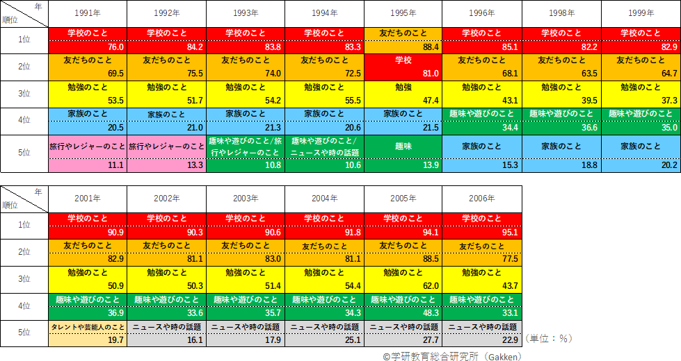 小学生女子が親と話すことも男子同様、「学校のこと」が群を抜いている。1995年の2位を除き、全ての調査期間で1位となっており、1991年を除く全調査期間で8割以上の小学生が親と話すこととして「学校のこと」を挙げている。また「学校のこと」を親と話す女子の割合は、2000年代に入ってからは9割を超えて上昇傾向にあり、2006年には95.1%にのぼる。