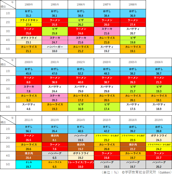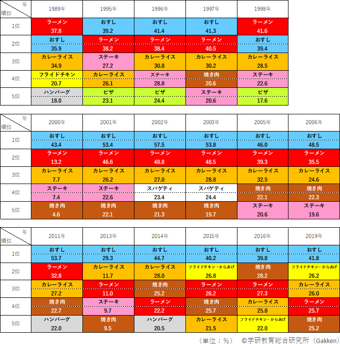 次いで人気なのが、「ラーメン」である。1990年代は「寿司」と僅差であったが、2000年代には2位が定席となり、2010年代は、「カレーライス」「フライドチキン・からあげ」「焼き肉」などと僅差で2~4位を争うなど、5位圏内の常連ではあるものの人気はやや下降気味である。