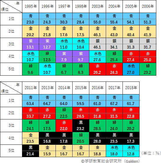 15回に渡る小学生男子の好きな色の推移を見て、まず指摘できるのは「青」が圧倒的に人気であり、全ての調査で1位についている。支持率についても、2000年代は全て5割を超え、2010年代には6割を維持し、2017年の調査では67.2%と7割近くに達していることがわかる。その他「金」「緑」「赤」「水色」は全調査を通じて似通っているが、「紫」「銀」は1995年から2006年、「黒」は2011年~2018年にランクインしている。