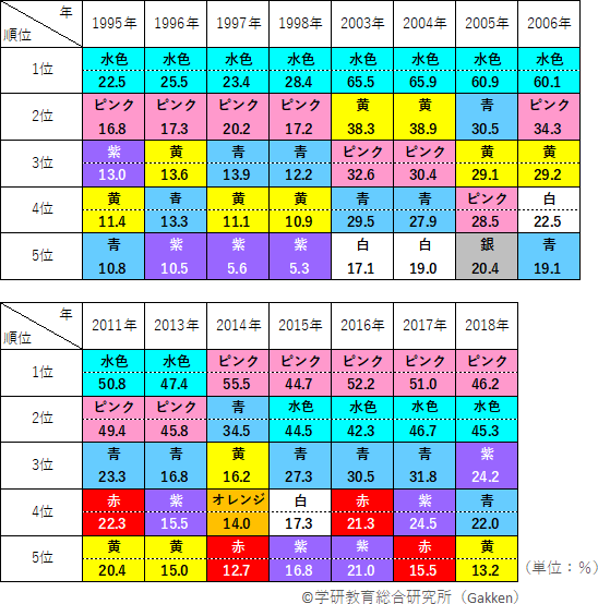 男子の調査結果と比較すると、男女共通して人気なのは「青」「水色」「赤」であり、一方で男子に人気であった「緑」「黒」は女子のランキングには登場せず、その代わりに「白」「黄色」がランクインしている点が異なる。