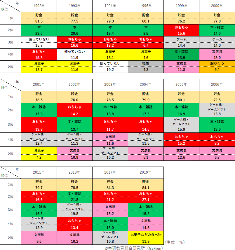 「貯金」に次ぐお年玉の使い道として、1990年代は「本・雑誌」が多かったが、2000年代に入ると「おもちゃ」「ゲーム機・ゲームソフト」の人気が高まる。特に2005年以降「ゲーム機・ゲームソフト」の人気が高まり、2005年に3位、2006年・2013年には2位にまでなっている。2000年代半ばから2010年代にかけて、女子の中でゲーム人気が高まったものと考えられる。おこづかいの使い道では「ゲーム機・ゲームソフト」について顕著な結果は現れなかったが、日常的にではなく高額臨時収入であるお年玉で買っている点が女子の特徴である。