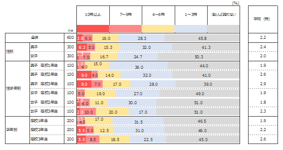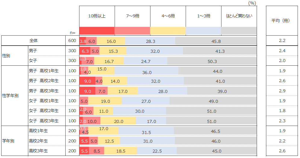 全体の平均は2.2冊。2017年度調査での中学生の平均は3.6冊であることから、中学生よりも1.4冊少ないことになる。「ほとんど買わない」と回答した層が中学生は70.5%であるのに対し、高校生は45.8%で、2人に1人以上が1冊以上参考書・問題集を購入している。高校生になると、何かしらの参考書・問題集を購入する生徒が増えることになるが、購入する冊数が少ないため、平均値が中学生よりも下がったと推察される。