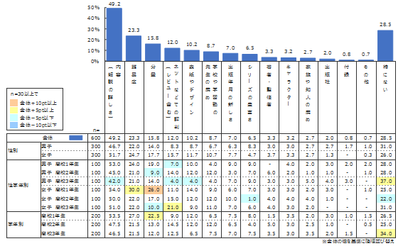 全体をみると、1位が「内容」(49.2%)、2位が「難易度」(23.3%)、3位が「分量」(15.8%)であった。このあたりは2018年度調査の小学生・2017年度調査の中学生とそれほど大きな違いは見られない。4位以下で特徴的なのは4位の「ネットなどでの評判(レビュー含む)」で、中学生が2.7%であったのに対し、高校生は12.0%と大きく増えたことだ。一方で、「学校や学習塾の先生の薦め」は中学生が13.2%であったのに対し、高校生は8.7%と下がった。参考書・問題集を選ぶ際には、先生の薦めよりも、その本の評価・評判を自分でネットで調べてから購入する高校生の姿が垣間みえる。一方で、「表紙やデザイン」といった見た目も重視する傾向にある点(中学生:3.8%、高校生:10.2%)も面白い。