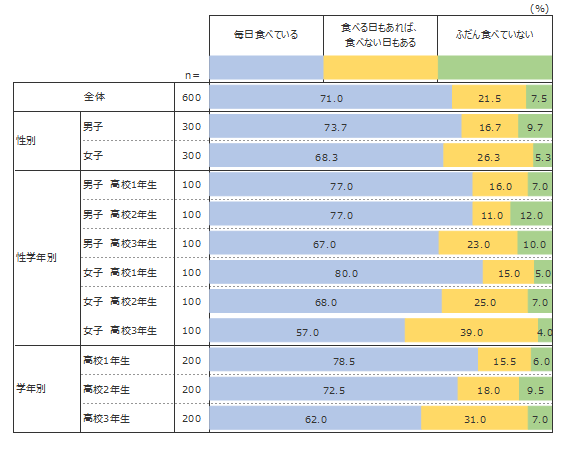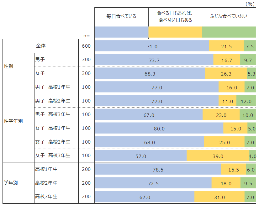 全体の平均をみると、「毎日食べている」高校生は71.0%であり、2017年度調査の中学生が朝食を「決まった時間に食べている」(≒毎日食べている)割合が86.3%であるのに対して減少していることがわかる。2018年度の小学生白書の調査結果が92.2%であることからも、小学生から進学するにつれて朝食をとる習慣が少しずつなくなっていく傾向が見受けられる。