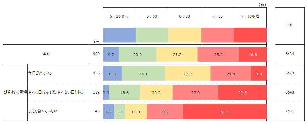 朝食をとる習慣は、2018年度調査の小学生では9割が「毎日食べている」のに対し、高校生では7割に減少していることが分かったが、起床時刻と朝食をとる習慣にはどのような関係性が見られるだろうか。