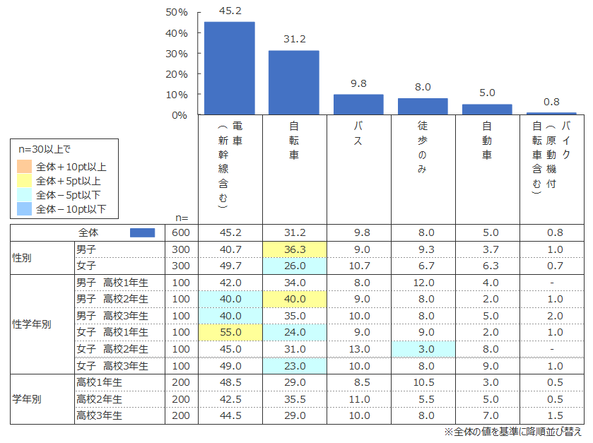 結果を見ると、45.2 %の生徒が「電車(新幹線含む)」と回答しており、2位の「自転車」(31.2 %)を大きく上回った。これは、中学校が全国に約10,000校あるのに対し、高等学校が約5,000校と少ないため、立地的に公共交通機関に頼らざるを得ない生徒が増えることに起因していると考えられる。