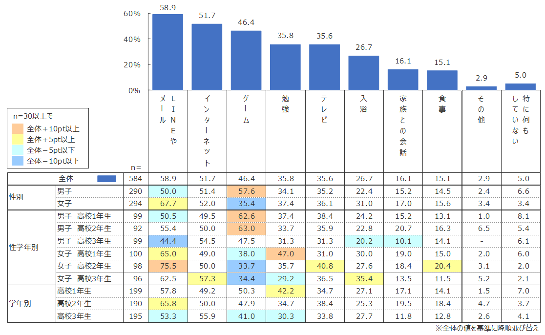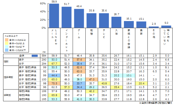 全体を見ると、最も多いのが「LINEやメール」(58.9%)、次いで「インターネット」(51.7%)、「ゲーム」(46.4%)となる。2018年調査の小学生で上位が「テレビ」(51.2%)、「家族との会話」(39.4%)、「ゲーム」(33.5%)であることと比べると、高校生は家族よりも外部との接触が増えていることが考えられる。