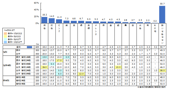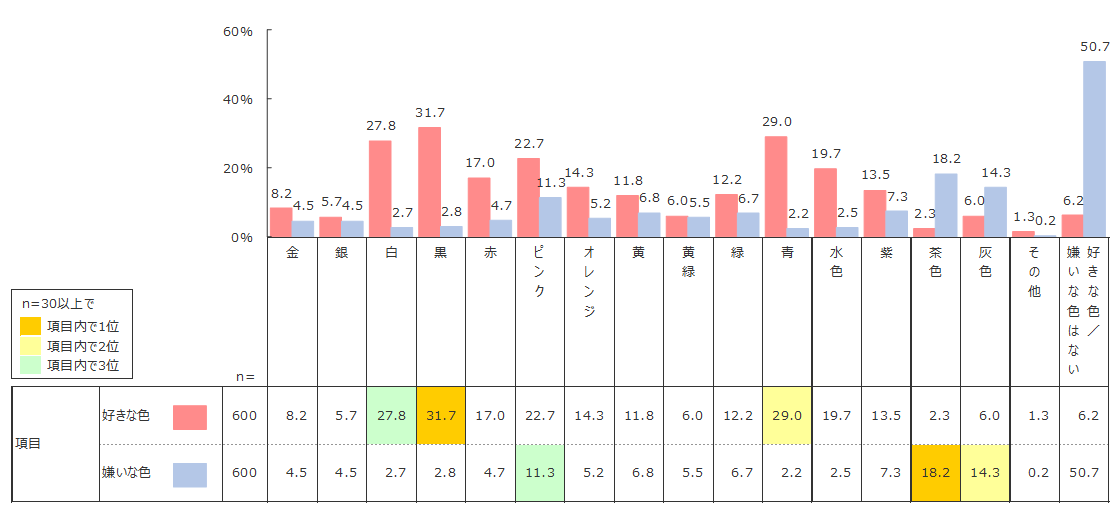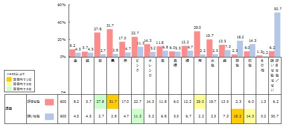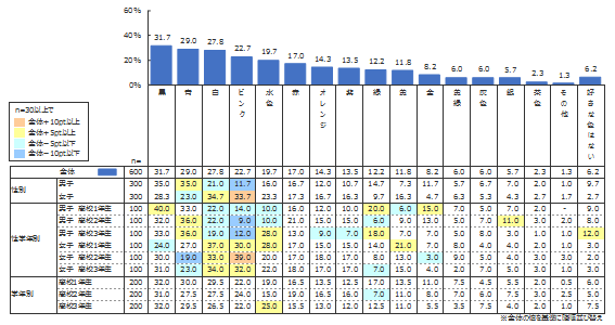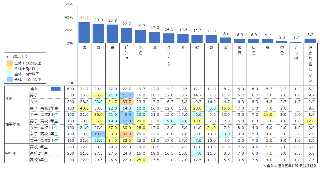 全体で見ると、好きな色の1位は「黒」(31.7%)、2位「青」(29.0%)、3位「白」(27.8%)、4位「ピンク」(22.7%)、5位「水色」(19.7%)となった。2017年度調査の中学生では1位「青」、2位「黒」だったが、高校生では順位が入れ替わっている。男女別に見ると、男子の好きな色の1位は「黒」と「青」(同率35.0%)、3位が「白」(21.0%)である。女子の好きな色の1位は「白」(34.7%)、2位「ピンク」(33.7%)、3位「黒」(28.3%)であった。小中高を通して「ピンク」と「水色」は女子の好きな色の上位に入っている。