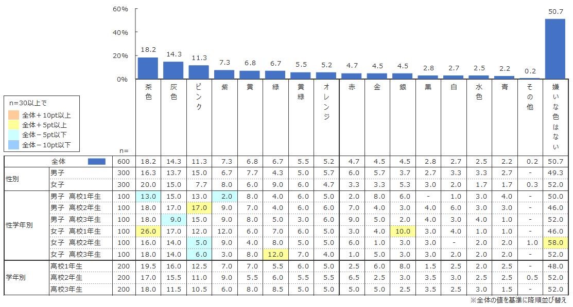 嫌いな色の1位は「茶色」(18.2%)、2位「灰色」(14.3%)、3位「ピンク」(11.3%)、4位「紫」(7.3%)、5位「黄」(6.8%)となった。男女別にみると、男子の嫌いな色の1位は「茶色」(16.3%)、2位「ピンク」(15.0%)、3位「灰色」(13.7%)である。女子の嫌いな色の1位は「茶色」(20.0%)、2位「灰色」(15.0%)、3位「緑」(9.0%)であった。2017年度調査の中学生でも「茶色」と「灰色」は嫌いな色の上位に上がっていた。