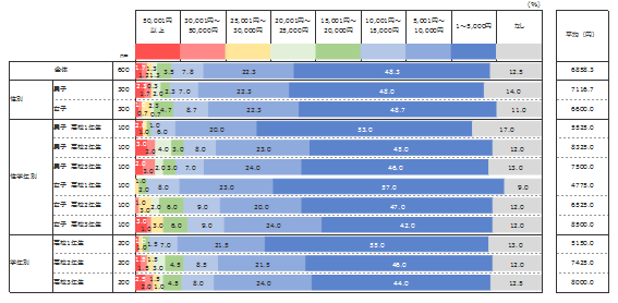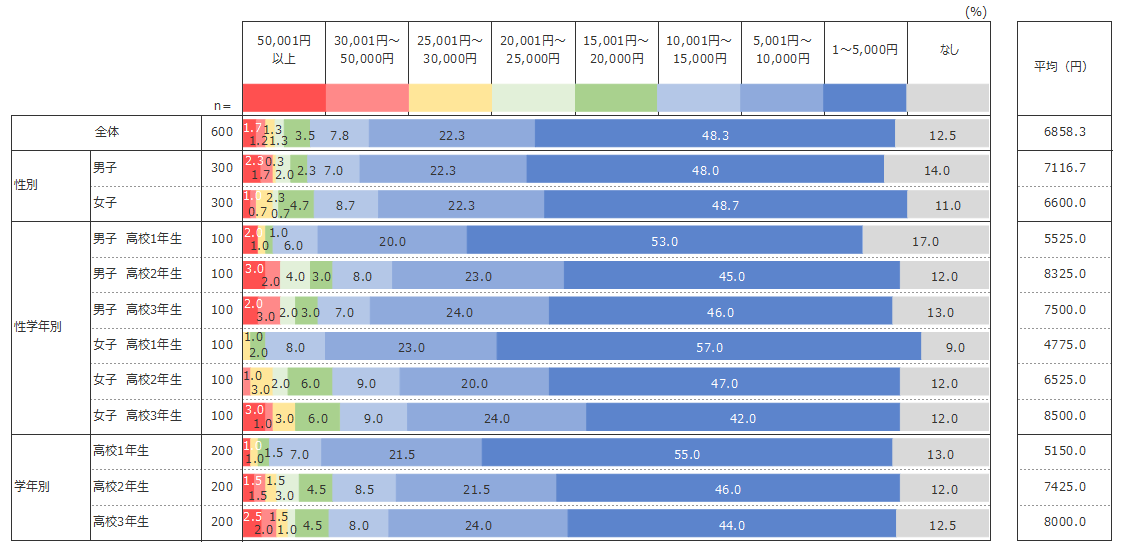 各学年の平均金額は、1年生が5,150円、2年生が7,425円、3年生が8,000円であり、学年が上がるごとに平均金額も増えている。一方で、「なし」と答える高校生も全体の1割強にのぼる。