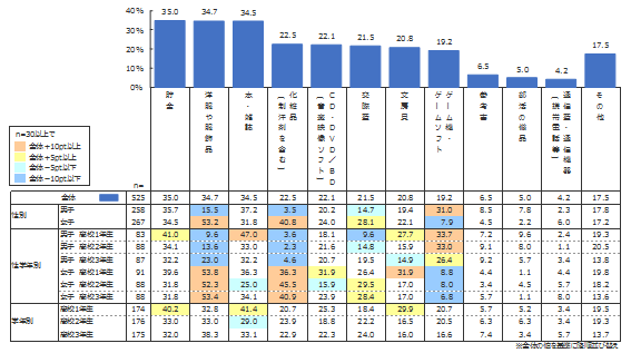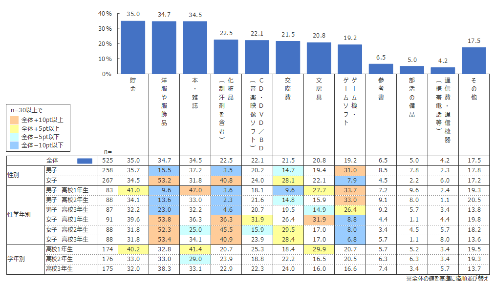 自由に使えるお金の使い道は、「貯金」(35.0%)、「洋服や服飾品」(34.7%)、「本・雑誌」(34.5%)がほぼ同率で1位であった。しかし、男女別に見ると、男子の1位は「本・雑誌」(37.2%)、2位は「貯金」(35.7%)、3位は「ゲーム機・ゲームソフト」(31.0%)であるのに対し、女子の1位は「洋服や服飾品」(53.2%)、2位は「化粧品」(40.8%)、3位は「貯金」(34.5%)であり、使い道に男女差が見られた。特に、女子で「洋服や服飾品」「化粧品」に使う割合が突出していた。