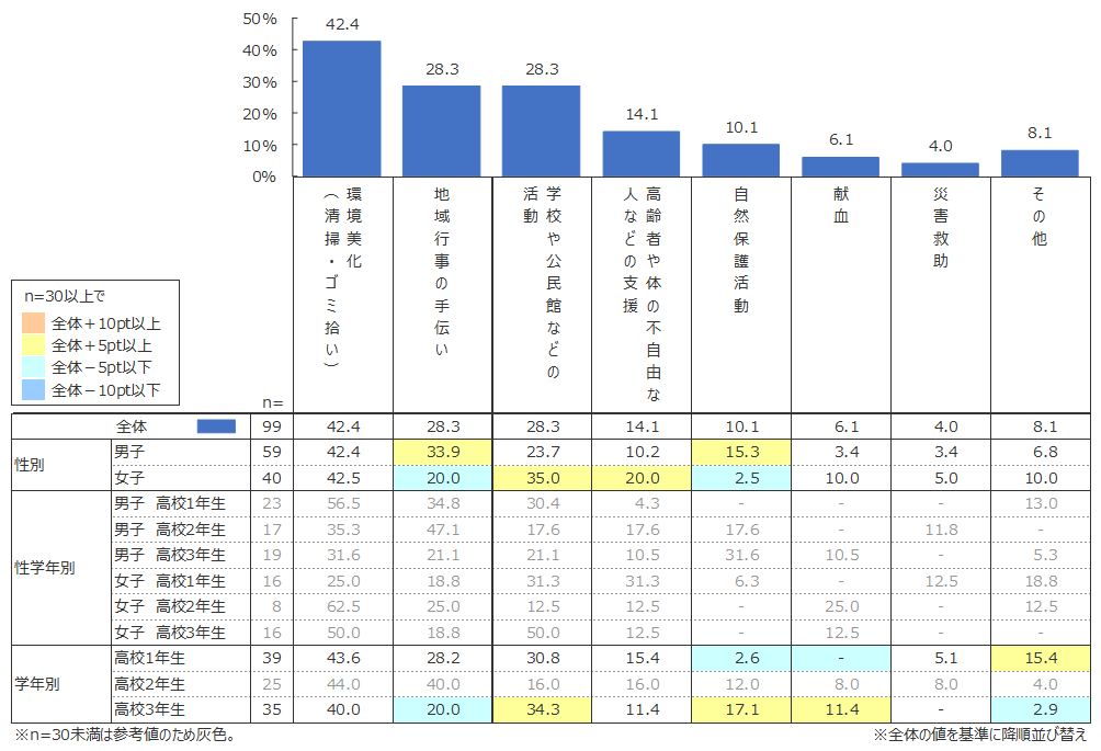 一方で、2位以下では男女差が見られた。男子は2位「地域行事の手伝い」、3位「学校や公民館のなど活動」、4位「自然保護活動」、女子は、2位「学校や公民館などの活動」、3位は同率で「地域行事の手伝い」「高齢者や体の不自由な人などの支援」であった。特に、活動が主に屋外である「自然保護活動」は男子で15.3%が参加しているのに対し、女子は2.5%と大きな差が見られた。