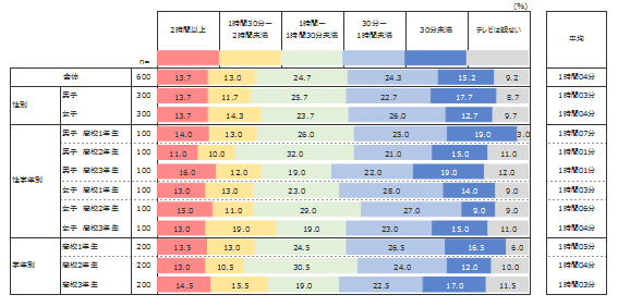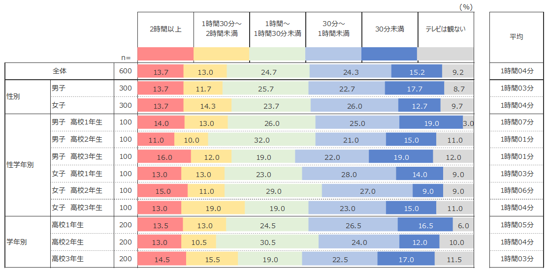 高校生の平日のテレビ視聴時間の全体平均は1時間04分であることが分かった。性学年別では大きな差異が見られないが、2017年度調査の小学生の結果(1時間19分)、2017年度調査の中学生の結果(1時間15分)と比較すると、学年が上がるにしたがって徐々にテレビを観る時間が減っていることが分かる。このことは22時以降の過ごし方にも表れており、2018年度調査の小学生の1位が「テレビ」(51.2%)であるのに対し、高校生は5位(35.6%)となっており、「LINEやメール」「インターネット」などと入れ替わっている。