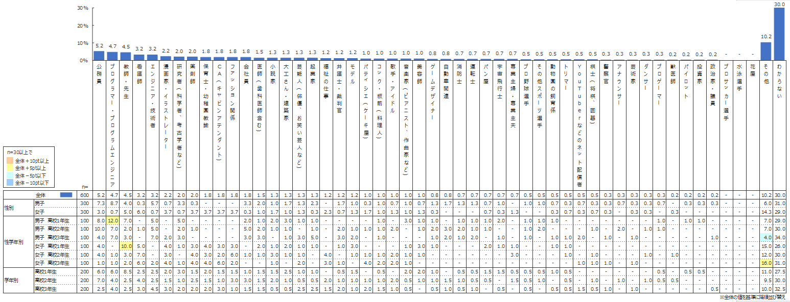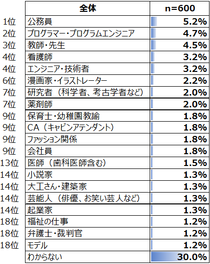 つきたい職業1位は「公務員」(5.2%)、2位「プログラマー・プログラムエンジニア」(4.7%)、3位「教師・先生」(4.5%)、4位は同率(3.2%)で「看護師」「エンジニア・技術者」となった。上位4位までの職業をみると、国家資格や専門的な技術が必要な職業が多く、高校生は堅実に職業選択を考えている傾向が強いようだ。2018年度調査の小学生の「将来つきたい職業」ランキングでは、上位を「パティシエ」「プロサッカー選手」「YouTuberなどのネット配信者」が占めており、小学生は華やかな職業に憧れる傾向が強いのに対し、高校生は将来への現実味が増してくることもあり、資格や専門性が必要なものや、安定性がありそうな職業を望んでいるのではないだろうか。