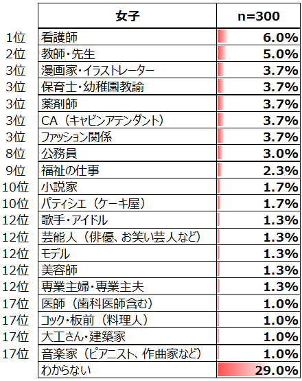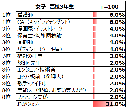 男女・学年別にみると、女子は全ての学年の3位以内に、「看護師」がランクインしている。