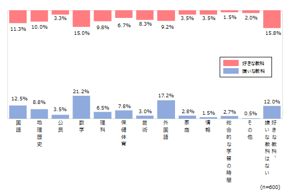 高校生が好きな教科は、1位「数学」(15.0%)、2位「国語」(11.3%)、3位「地理・歴史」(10.0%)、4位「理科」(9.8%)、5位「外国語」(9.2%)。嫌いな教科は、1位「数学」(21.2%)、2位「外国語」(17.2%)、3位「国語」(12.5%)、4位「地理・歴史」(8.8%)、5位「保健・体育」(7.8%)となった。