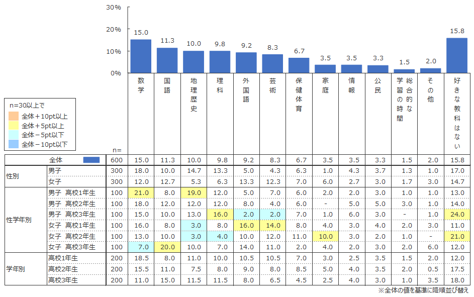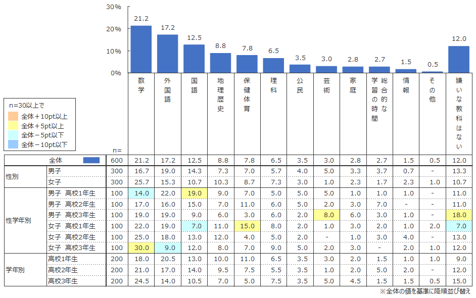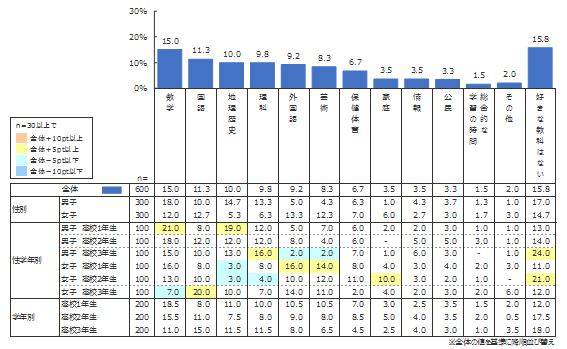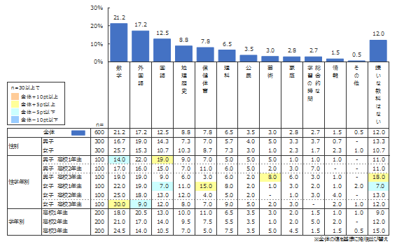 男女別に「数学」と「外国語」に着目すると、男子の「好きな教科」は1位が「数学」(18.0%)、「外国語」(5.0%)は6位であった。一方、女子の「好きな教科」1位は「外国語」(13.3%)で、「数学」(12.0%)は4位であった。好きな教科ではあるものの男女で逆転している。「嫌いな教科」で男子の1位は「外国語」(19.0%)、2位が「数学」(16.7%)、女子では「数学」が1位(25.7%)で、2位が「外国語」(15.3%)である。 1位、2位の違いこそあれ、嫌いな教科では男女ともに「数学」と「外国語」が共通して上位に上がっている。