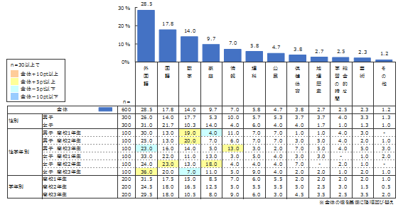 調査では、1位「外国語」(28.5%)、2位「国語」(17.8%)、3位「数学」(14.0%)、4位「家庭」(9.7%)、5位「情報」(7.0%)という結果になった。「外国語」は2位「国語」に10.7ポイントの差をつけてのトップである。背景として、現代社会のグローバル化や、東京オリンピック・パラリンピックの開催などがあることが想像に難くない。「好きな教科・嫌いな教科」の調査で「外国語」は、好きな教科の5位、嫌いな教科の2位であった。高校生は、将来の必要性と外国語への苦手意識の間でジレンマを抱えているようである。