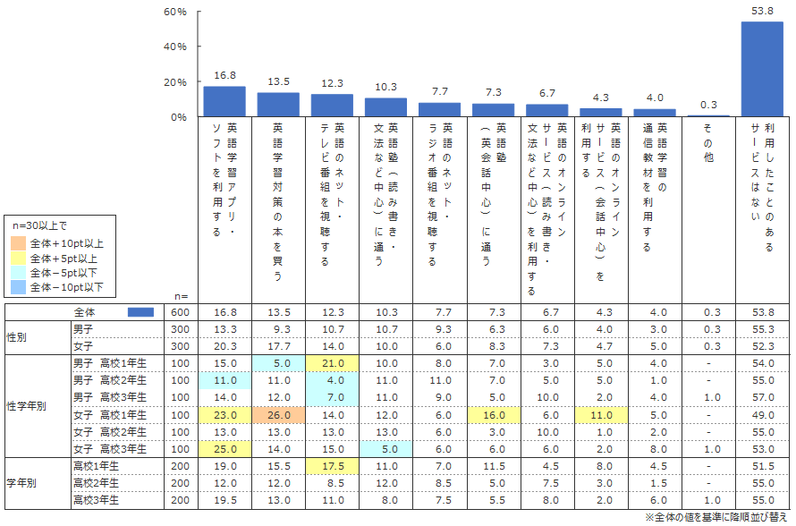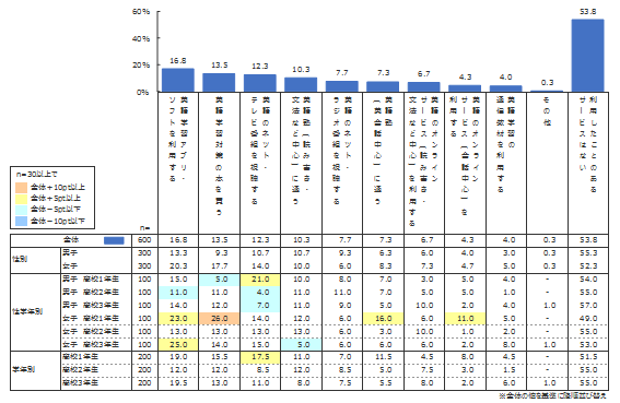 教科を特定しない調査でも利用割合の1位であったスマホアプリは、英語学習においても全体の16.8%と最も多い割合で利用されている。書籍に付属した無料の英単語学習アプリや音声が聞けるアプリなど、費用をかけずに利用できる便利なアプリが存在することからも、多くの高校生が利用していることは納得できる。また、英語学習本、ラジオ、テレビなどの従来の学習サービスも根強い人気があることが調査から見て取れる。
