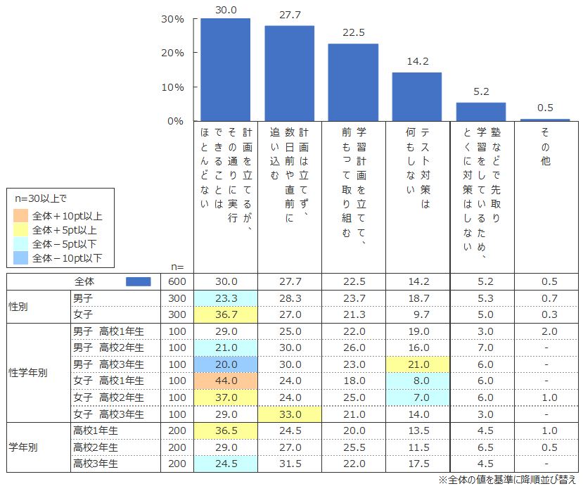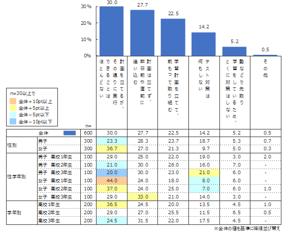 定期テストは多くの場合、試験範囲が事前に先生から発表される。その限定されたテスト範囲について計画を立てて勉強するというのが定期テスト対策の定石と思われるが、計画を立てて準備をしている高校生の割合は22.5%とそれほど高くない。テスト範囲が限定されているがゆえだろうが、数日前や直前に準備をする、いわゆる「一夜漬け」をする高校生の割合が27.7%とかなり高い。