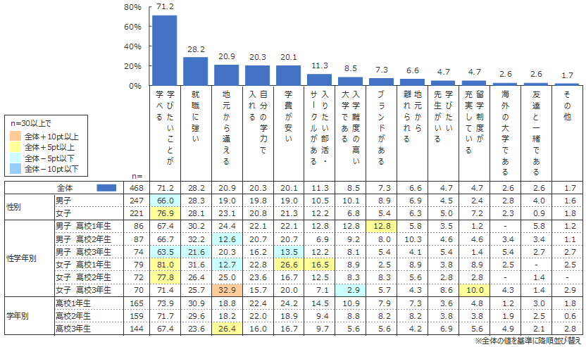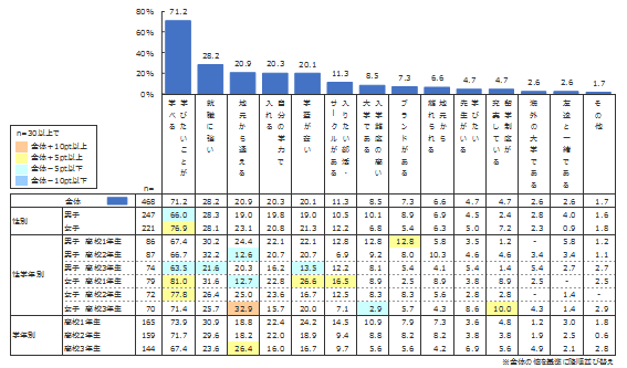 なお、高校3年生女子では、「地元から通える」割合が32.9%と有意に高く、また「留学制度が充実している」の割合も10.0%と、他のカテゴリに比べて高い数値であることも目を引く。
