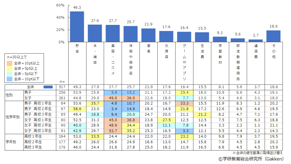 高校生のおこづかいの主な使い道は何だろうか。おこづかいを「もらっている」517人に質問した。