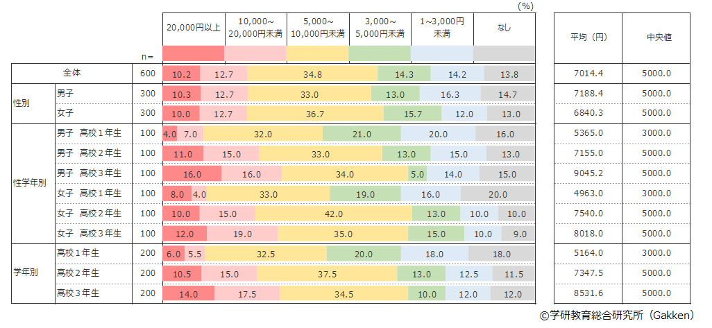 高校生でおこづかいを「もらっている」割合は86.2%であり、全体平均金額は7,014円であった。学年が上がるにつれて平均金額も上がるが、なかでも「10,000~20,000円未満」「20,000円以上」もらっている割合が高校1年生から高校3年生になると2~3倍の割合になる点は興味深い。平均金額の上昇はこの層が後押ししているようだ。
