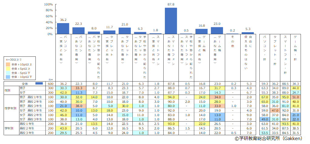 全体平均をみると、1位は「スマートフォン(あなた専用)」(87.8%)で突出している。次いで「パソコン(家族と共有)」(36.2%)、「ゲーム機(あなた専用)」(23.0%)となった。