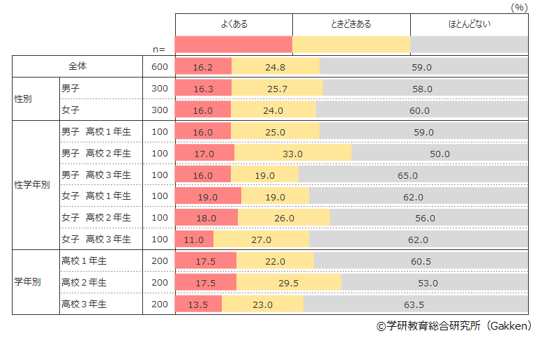 学年別にみると、高校2年生の「よくある」「ときどきある」割合が47.0%と最も多い。一方で高校3年生は最も低い割合(36.5%)と高校2年生よりも10.5ポイント減少していることから、受験勉強を意識した行動が反映されている可能性が考えられる。