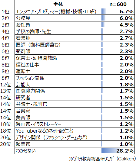 1位の「エンジニア・プログラマー(機械・技術・IT系)」は、前回の2018年度調査の選択肢「プログラマー・プログラムエンジニア」と「エンジニア・技術者」を統合した項目だが、2021年は前回の人気を引き継いで堂々の1位となった。この職業は男女の人気差が目立ち、男子は11.3%、女子は2.0%と男子人気が圧倒的に高い。