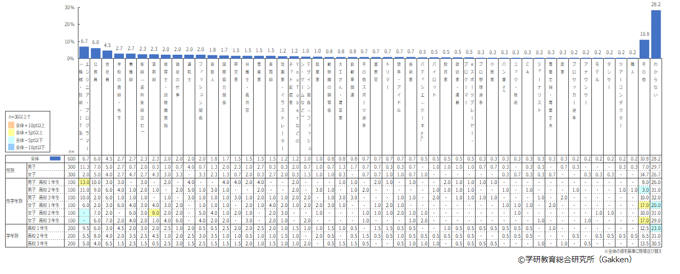 さらに、18位「YouTuberなどのネット配信者」(1.2%)が高校生の全体ランキングに初めてランクインした点は見逃せない。昨今の「YouTuber」は、SNSを通して世間に大きな影響を与える“インフルエンサー”としての社会的認知度が高まっており、バラエティ番組やCMに出演する機会も増えている。さらに、新型コロナウイルス感染拡大の状況下では政治家や専門家との意見交換を通じて感染拡大防止の呼びかけを行うなど、社会貢献の役割を担うなど、とくに若い世代への訴求力の強さは社会的にも高く評価されていると言える。