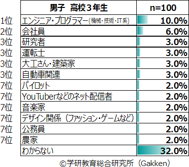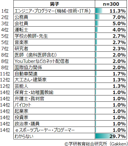 男子の全体ランキングは1位「エンジニア・プログラマー(機械・技術・IT系)」(11.3%)、2位「公務員」(7.0%)、3位「会社員」(5.0%)となった。女子全体のトップ20のランキングと比較すると、共通して人気の職業は「エンジニア」「公務員」「会社員」「学校の教師・先生」「医師(歯科医師含む)」「国際協力関係」「保育士・幼稚園教諭」「芸能人」「起業家」である。